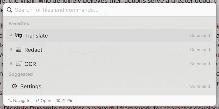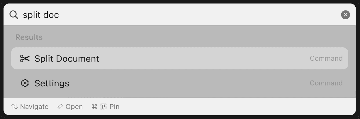 To preserve this clean interface while providing powerful functionality, I designed the Command Center. Activated with Cmd+T, it gives users instant access to search, commands, and navigation without leaving their document. This keeps the main UI clean while ensuring that advanced functionality is always just a keystroke away.